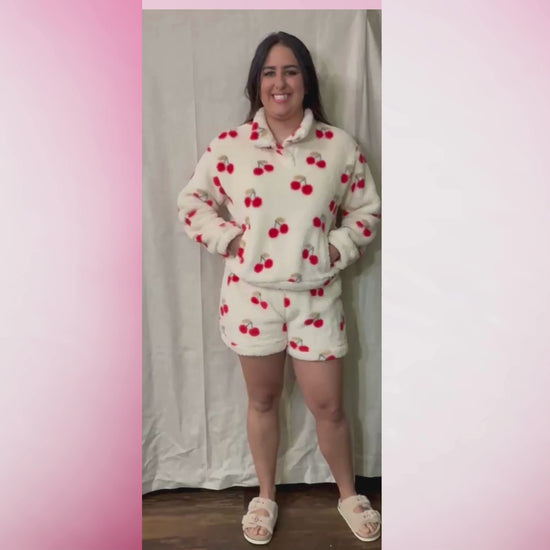 Soft, cozy, and irresistibly cute, this cherry-print lounge set is the perfect finishing touch to your comfy wardrobe. Made from plush fuzzy fabric, this matching pullover and shorts set delivers all-day comfort with effortless style.