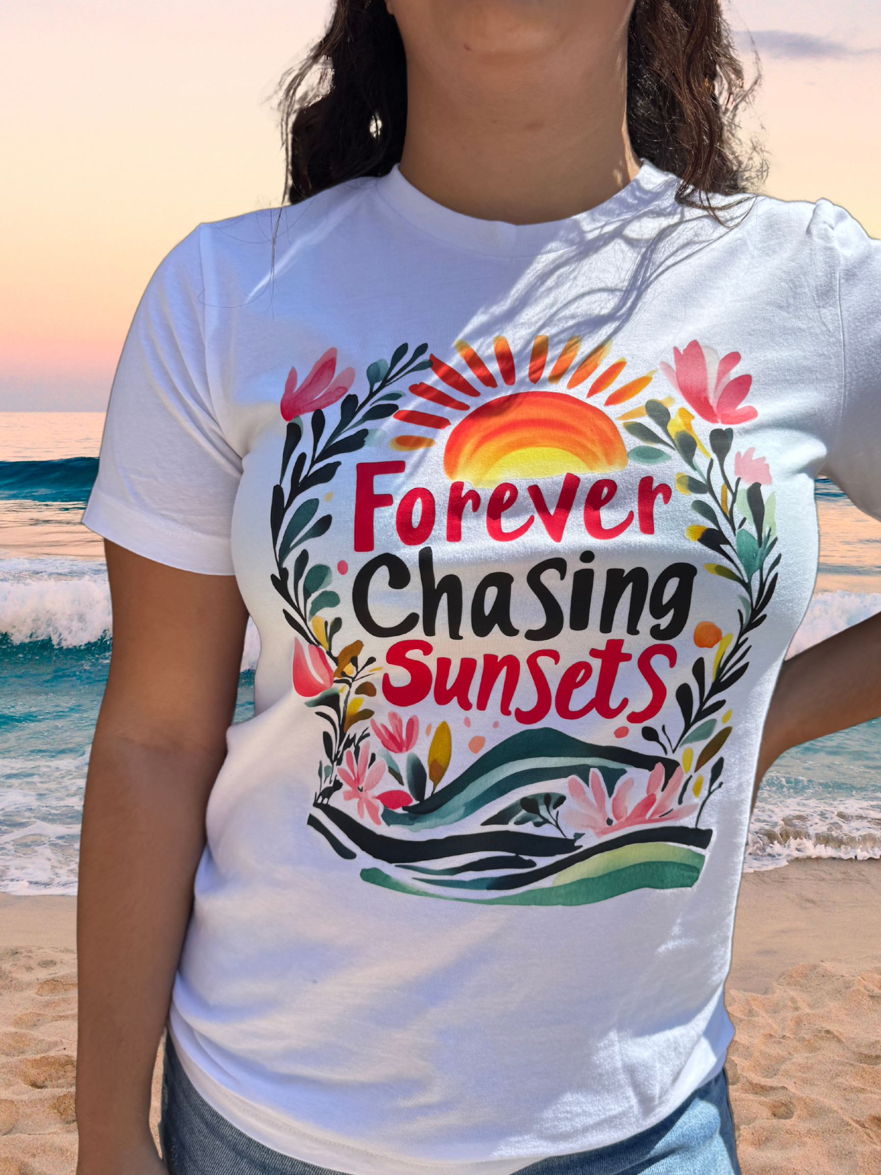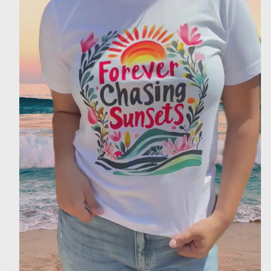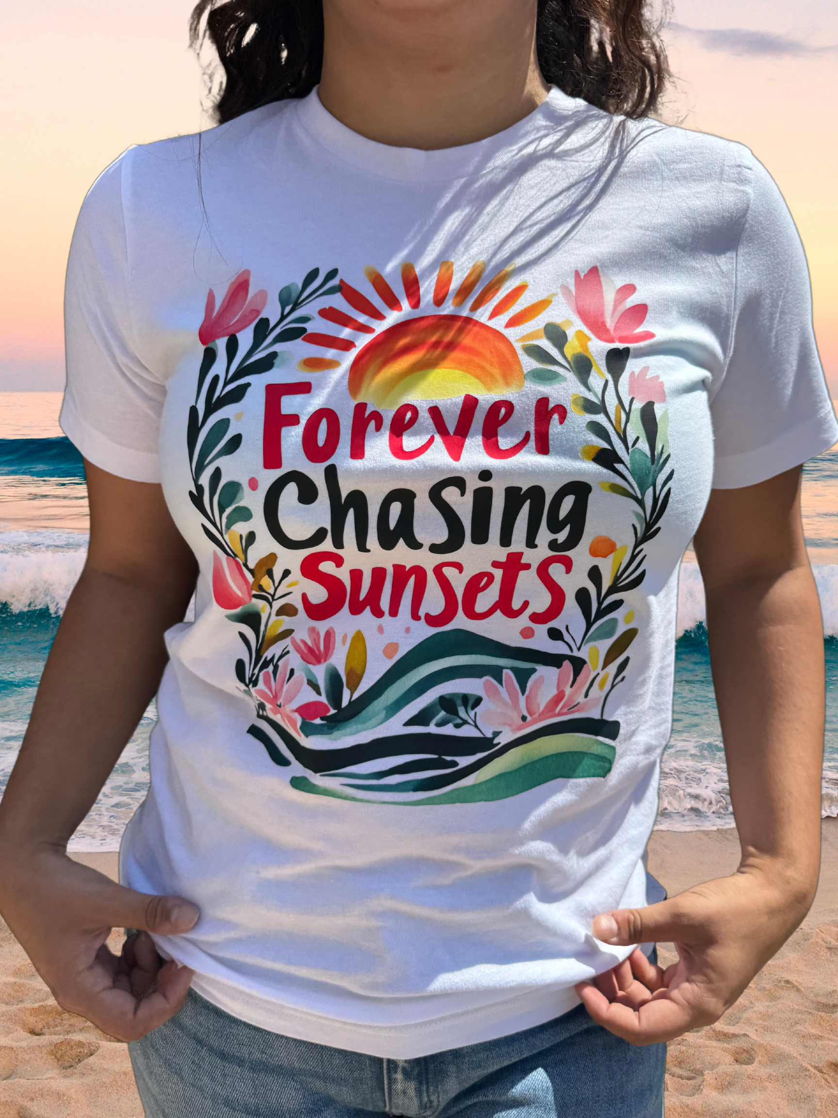 Embrace the carefree coastal vibe with our "Forever Chasing Sunsets" Comfort Colors Tee! This ultra-soft, garment-dyed tee features a vintage-inspired floral sunset and ocean wave design, capturing the magic of golden hour. Our graphics are made with the latest DTF technology!