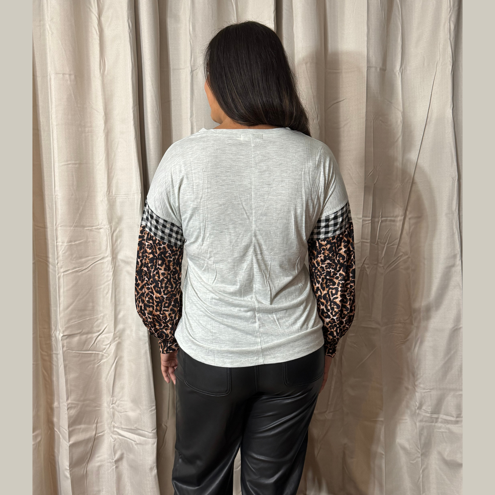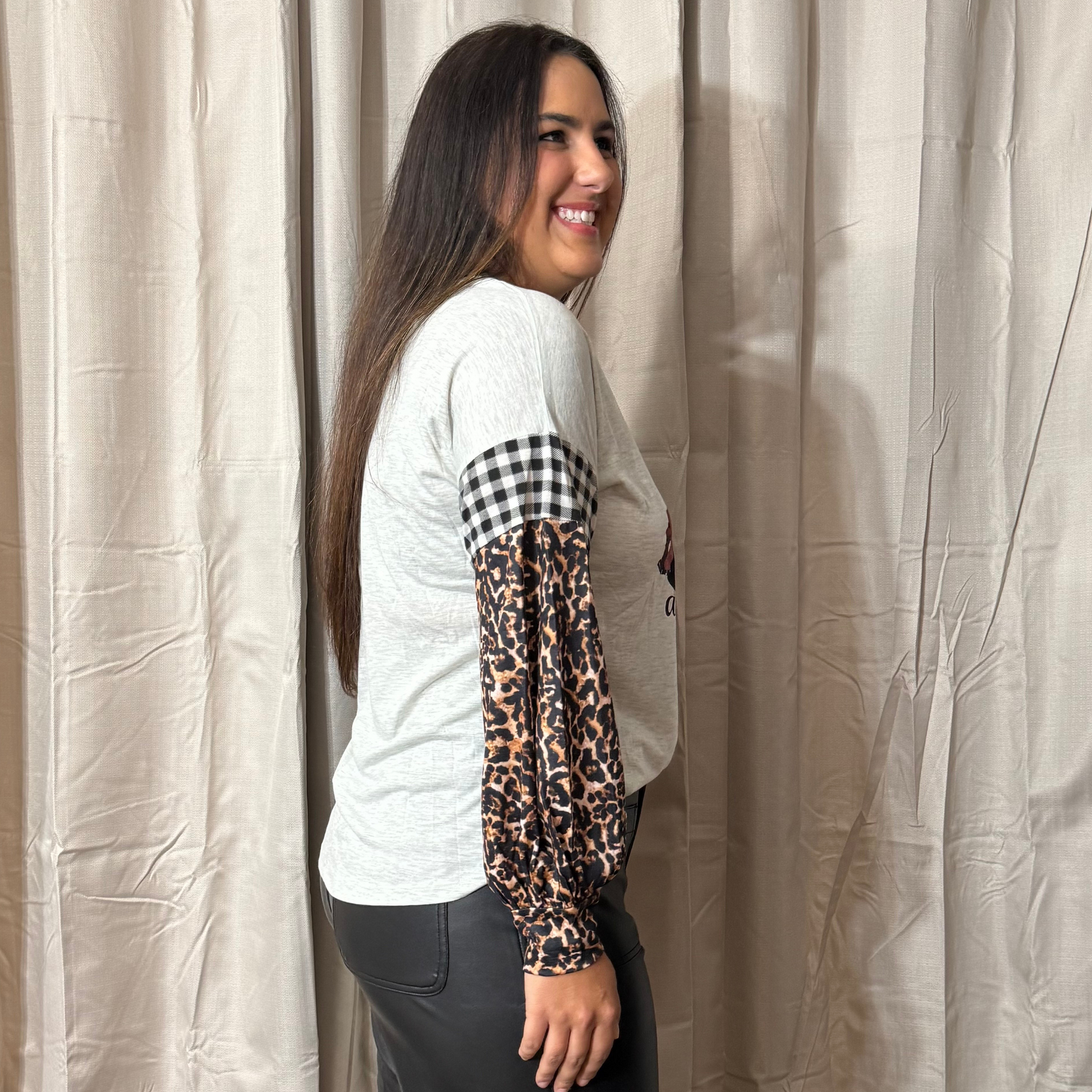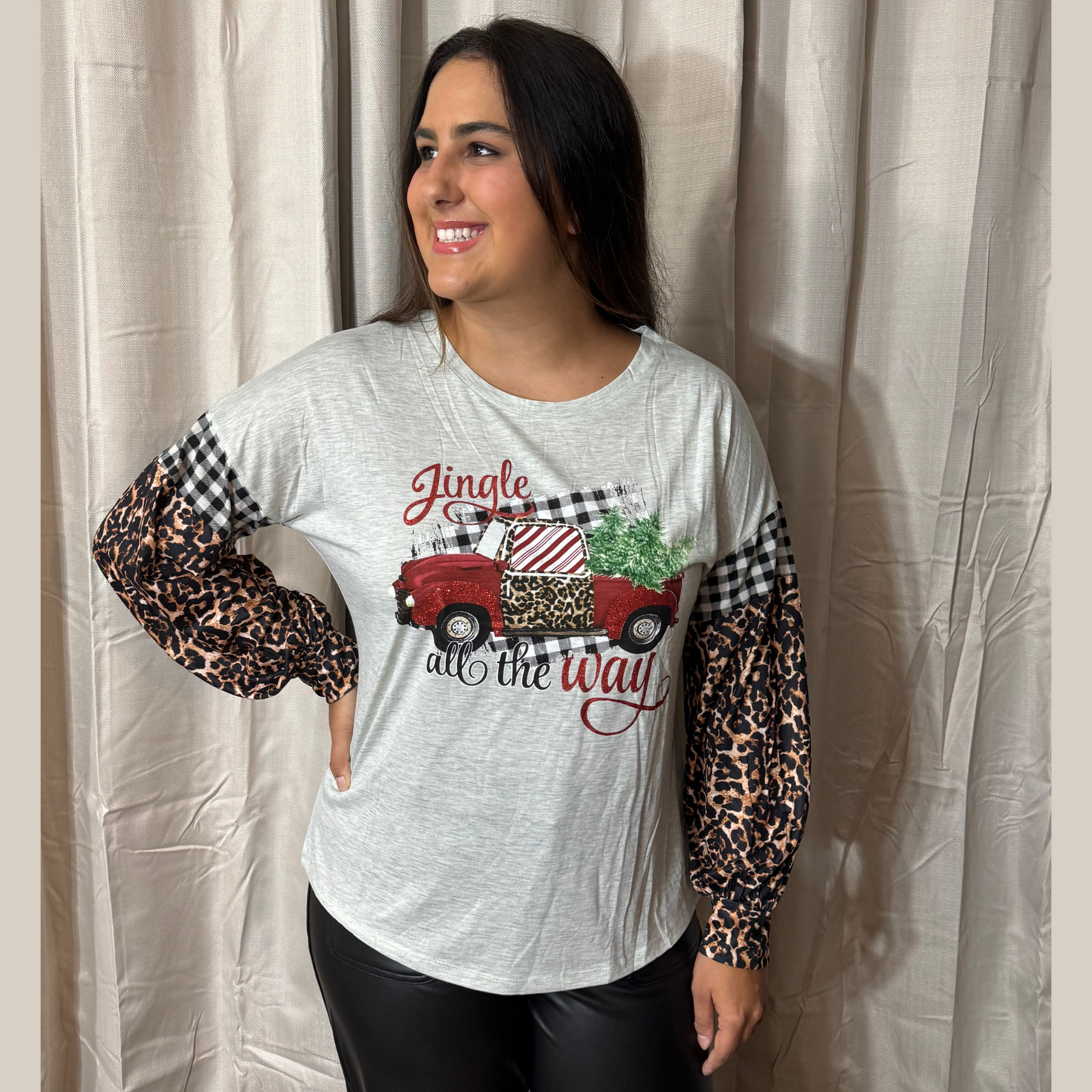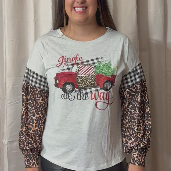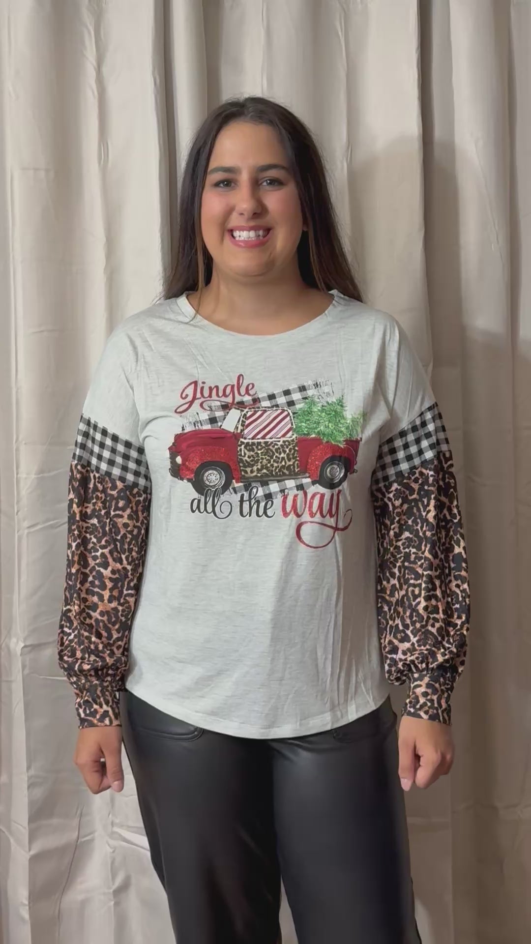 Bring holiday cheer in style with this festive cream shirt! The front showcases a vintage red truck carrying gifts and a Christmas tree with a fun “Jingle All The Way” message. What really makes it pop are the sleeves—buffalo gingham at the shoulders flowing into bold leopard print for a trendy, playful twist.