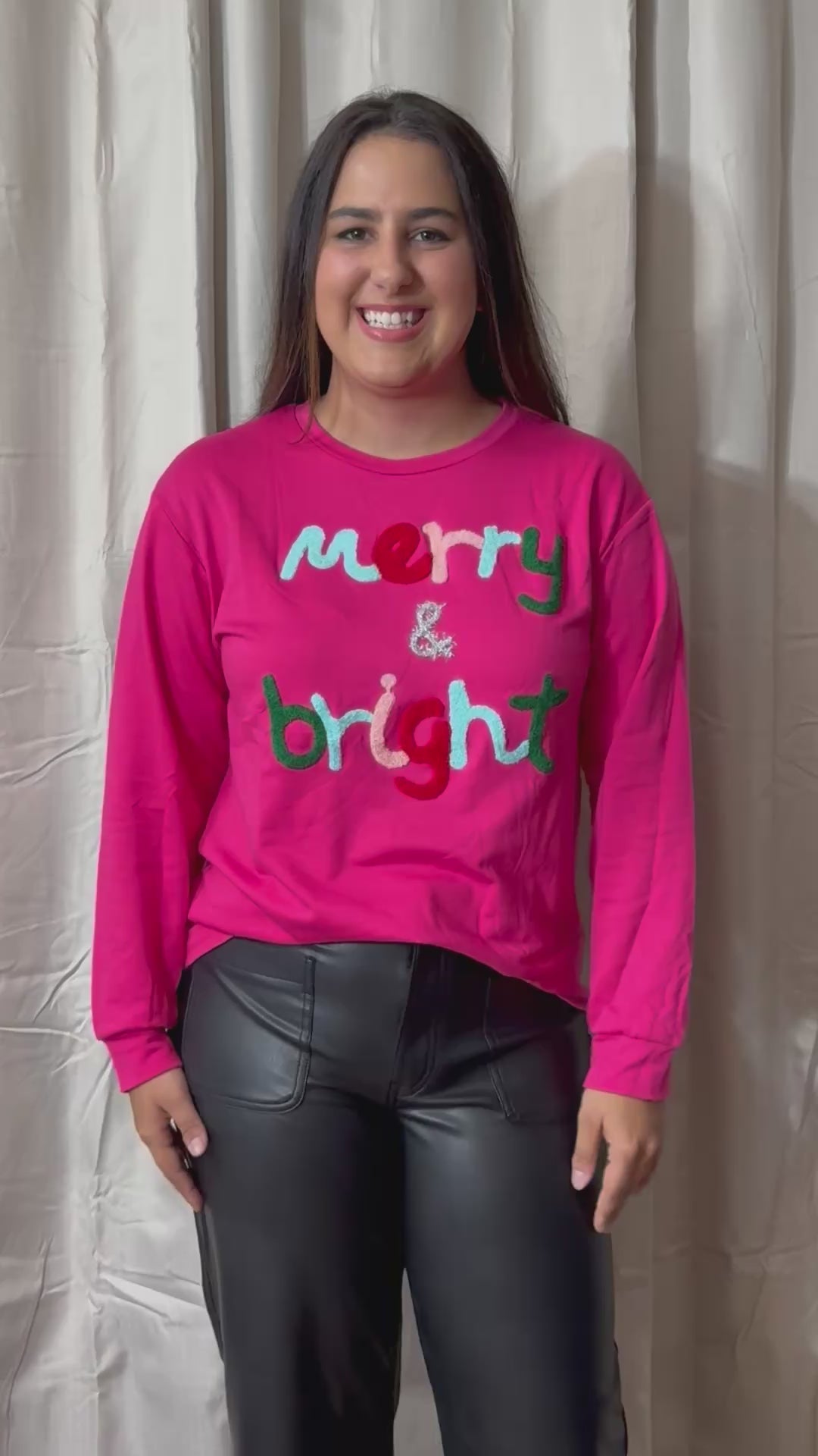 Bring the holiday cheer with this bold and festive Merry & Bright pullover! Featuring playful lettering in vibrant holiday colors on a hot pink base, it’s the perfect mix of cozy comfort and fun seasonal style. Great for Christmas parties, casual outings, or relaxing by the tree.