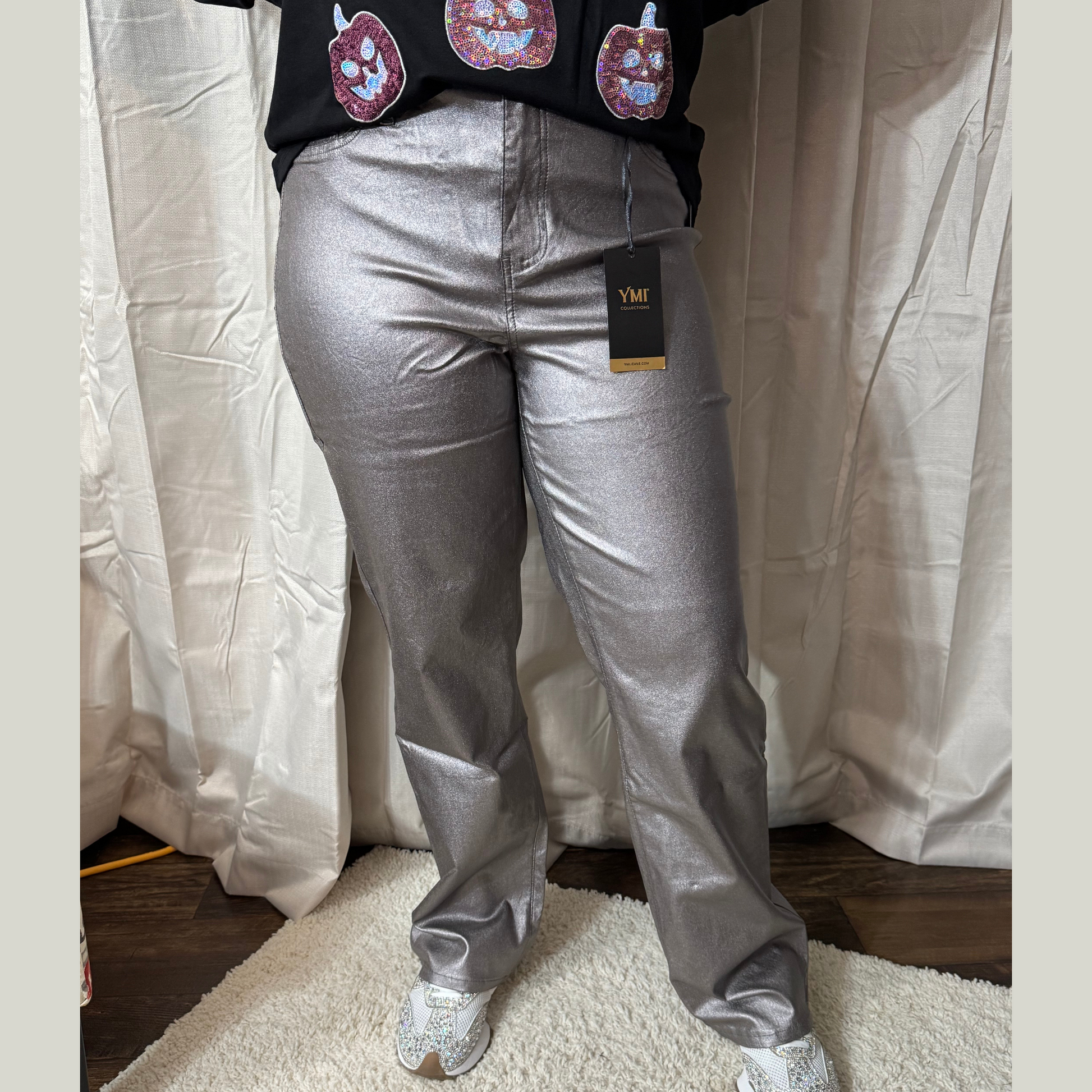 Step into confidence with the Junior/Junior Plus High Rise Straight Leg Metallic Pant by YMI Jeans – the perfect blend of sleek sophistication and modern edge. Designed with a metallic finish that catches the light, these pants are your go-to for nights out, holiday parties, or elevating your everyday look.