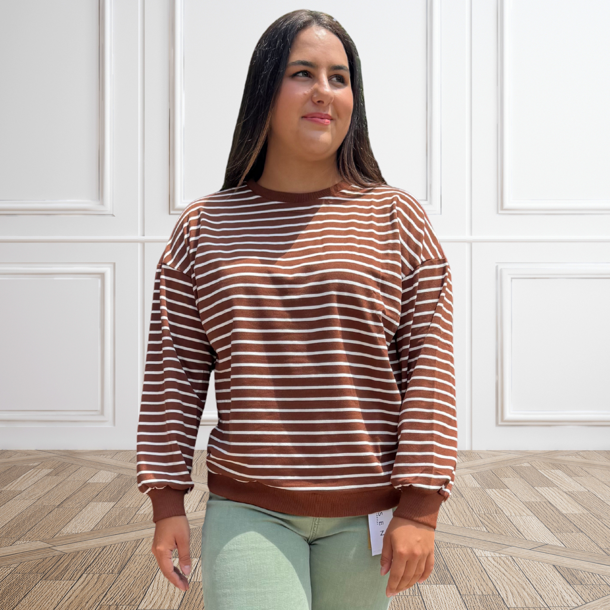 Your new go-to for cozy, casual style! The Mocha Moves Stripe Sweatshirt features a soft blend of cotton, polyester, and spandex for the perfect stretch and comfort. The rich brown tones and classic stripe design make it easy to pair with denim, leggings, or joggers. Lightweight yet cozy—perfect for layering or lounging.