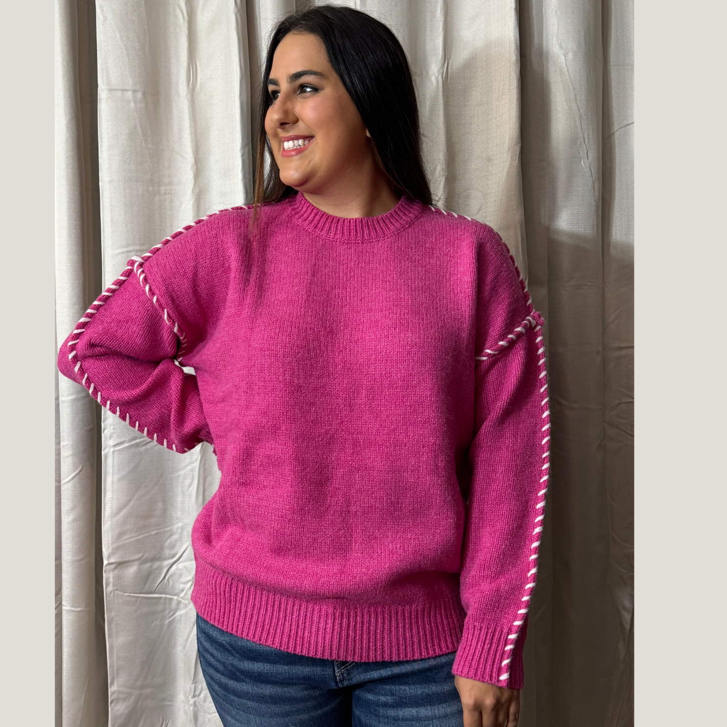 Brighten your wardrobe with this PINK POP STITCH SWEATER BY WHITE BIRCH, crafted from lightweight acrylic knit fabric. Featuring a classic round neck and relaxed fit, the sweater is detailed with contrast stitch lining for a subtle, stylish finish. Perfect for layering or wearing solo for a pop of vibrant color.