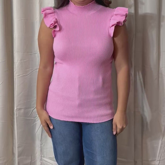 Pink Sleeveless Solid Knit Mock Neck Top with Flutter Sleeves