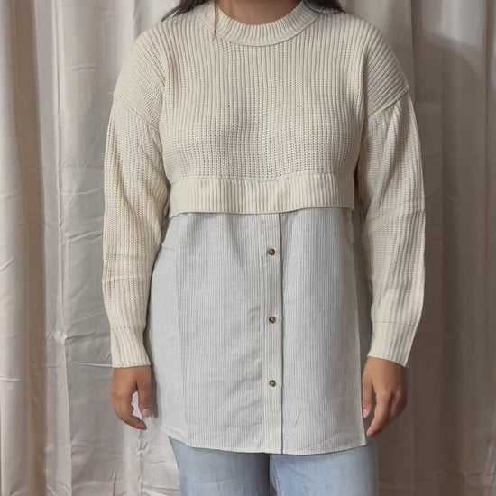 Elevate your layering game with this long sleeve, solid knit top featuring a round neck and a unique half sweater front paired with a buttoned-down body. Crafted from lightweight polyester knit, layer over your favorite camisoles or bralettes. Ideal for adding subtle texture and style to any outfit.