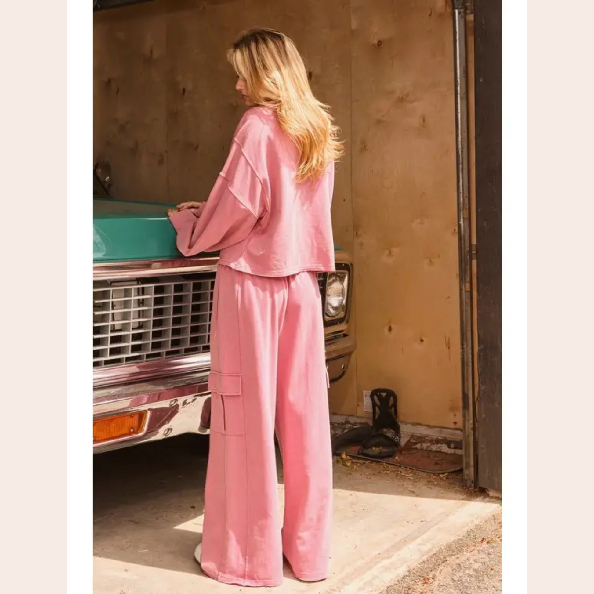 The sweatshirt features a relaxed, drop-shoulder fit with raw-edge detailing, while the coordinating pants include side pockets and an elastic waist with adjustable drawstring for the ideal blend of style and ease.